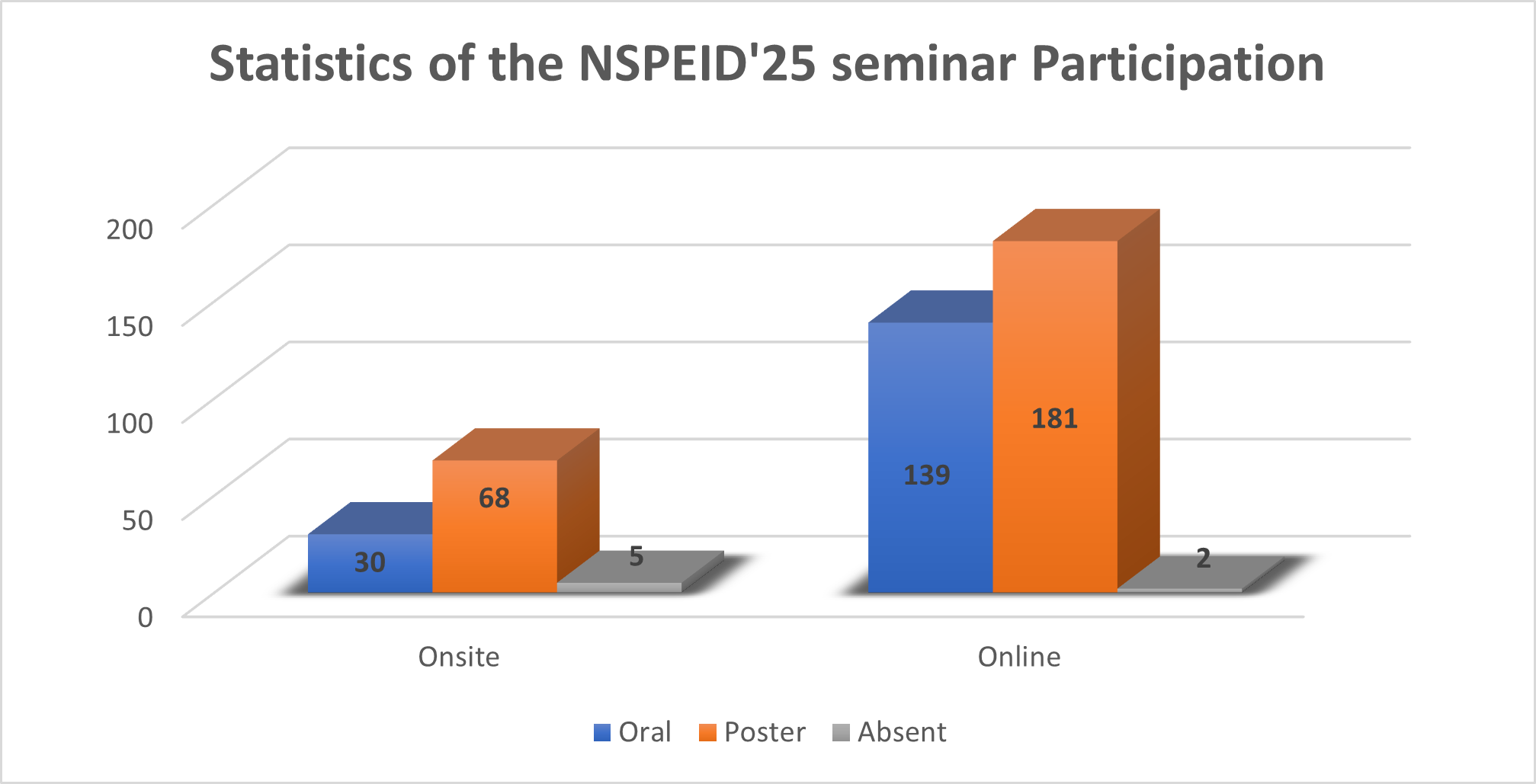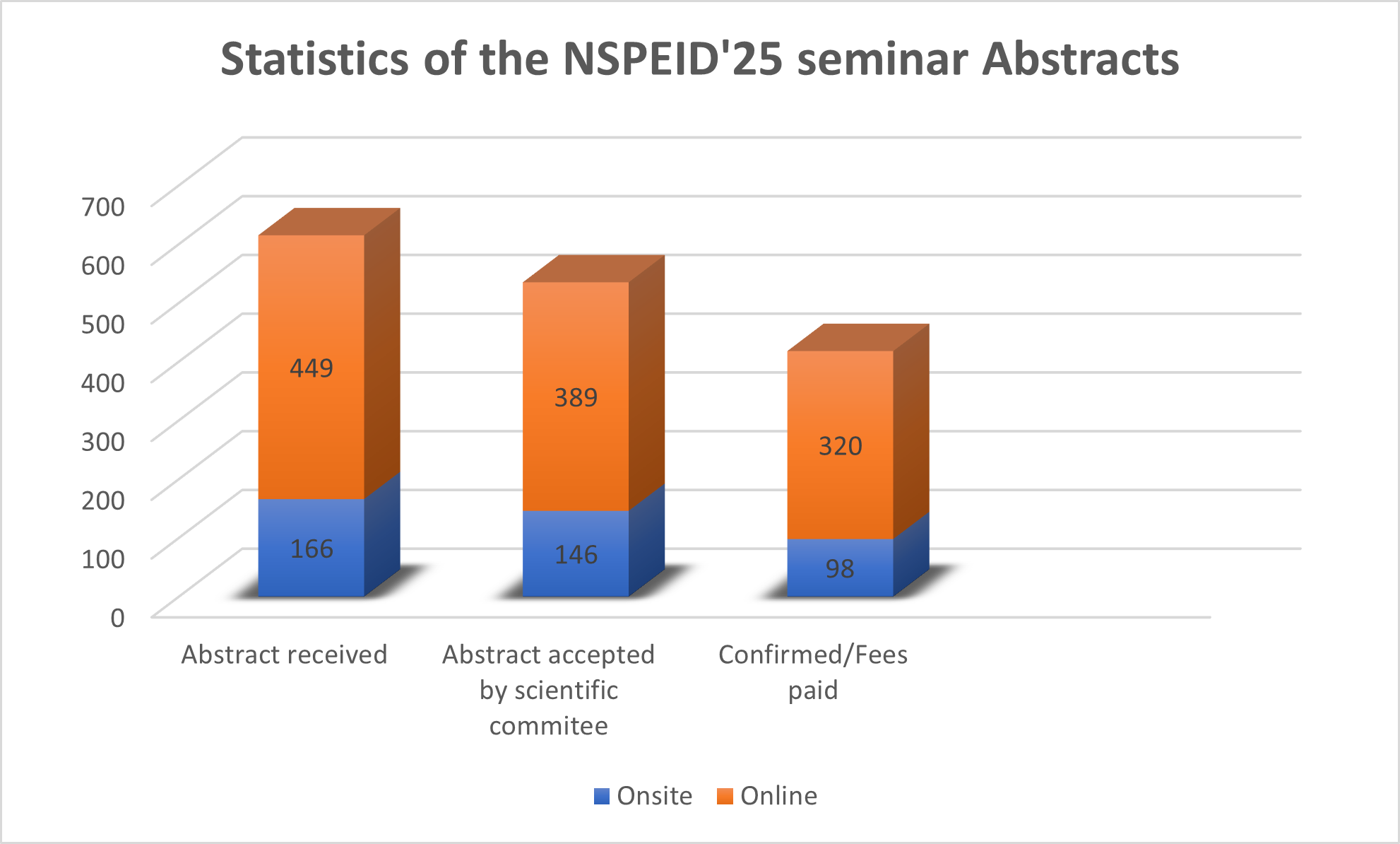 The NSPEID seminar recorded a total of 615 abstracts, reflecting strong scientific interest in the event. Among these submissions, 166 abstracts were intended for in-person participation, while 449 were submitted for online participation. This distribution highlights a clear preference for the virtual format, while still maintaining a significant number of in-person contributions.
